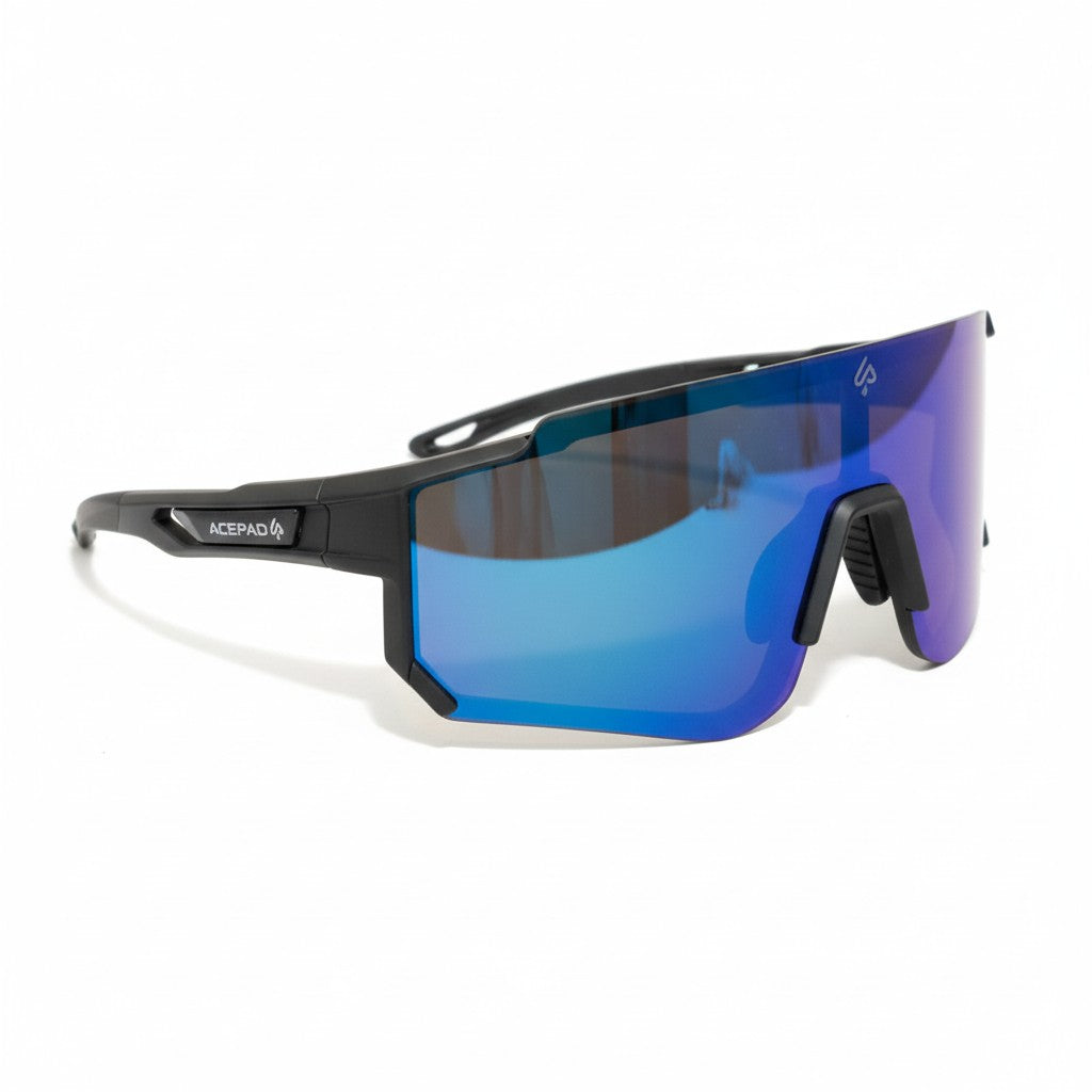 Occhiali da sole da padel con lente blu specchiata. Include custodia rigida con moschettone, custodia morbida, panno in microfibra e montatura interna trasparente per lenti da vista.